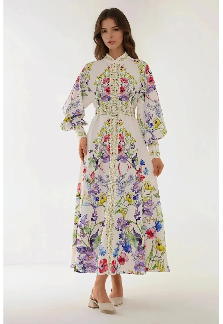 Rochie maxi maneca lunga – imprimeu – alb – bumbac – poliester – lycra – Reduceri Exclusive