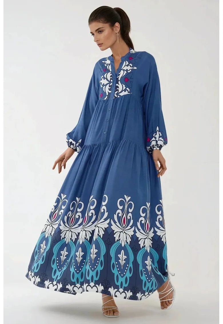Rochie maxi maneca lunga – imprimeu – albastra/alb – viscoza – Reduceri Exclusive