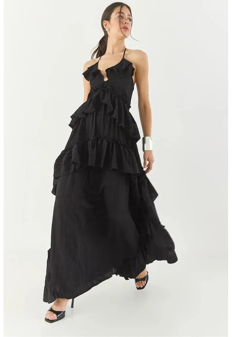 Rochie maxi – texturata – guler halter – volane – negru – bumbac-viscoza