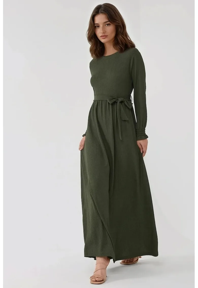 Rochie maxi –  texturata – guler rotund – kaki – jerseu
