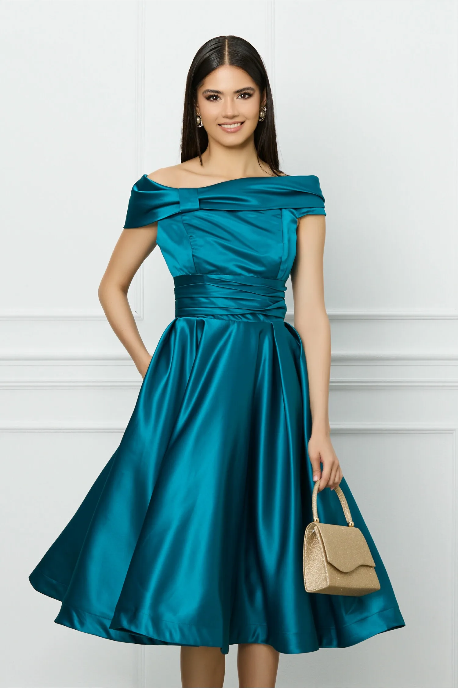 Rochie MBG turcoaz din tafta cu umeri goi – Reduceri Exclusive