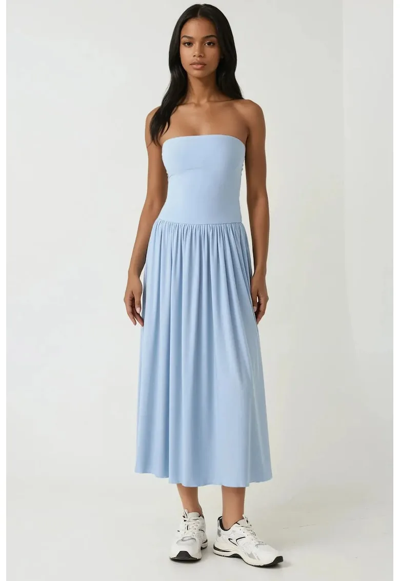 Rochie midi 2 in 1 – fara bretele – elastica – albastra – jerseu – Reduceri Exclusive