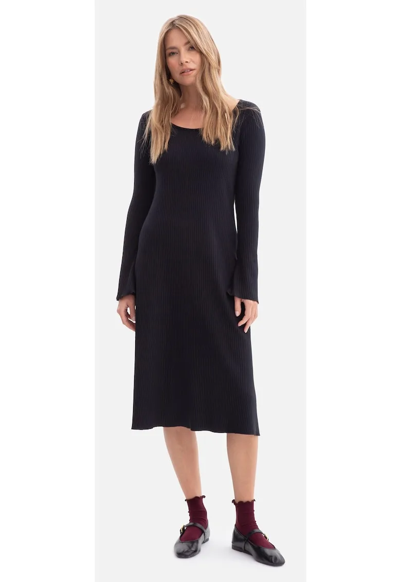 Rochie midi – B308 neagra tricot cu dungi – casual – decolteu rotund – necaptusita – fara buzunare – maneci lungi – usor evazata in partea de jos – fara inchizatoare – Reduceri Exclusive