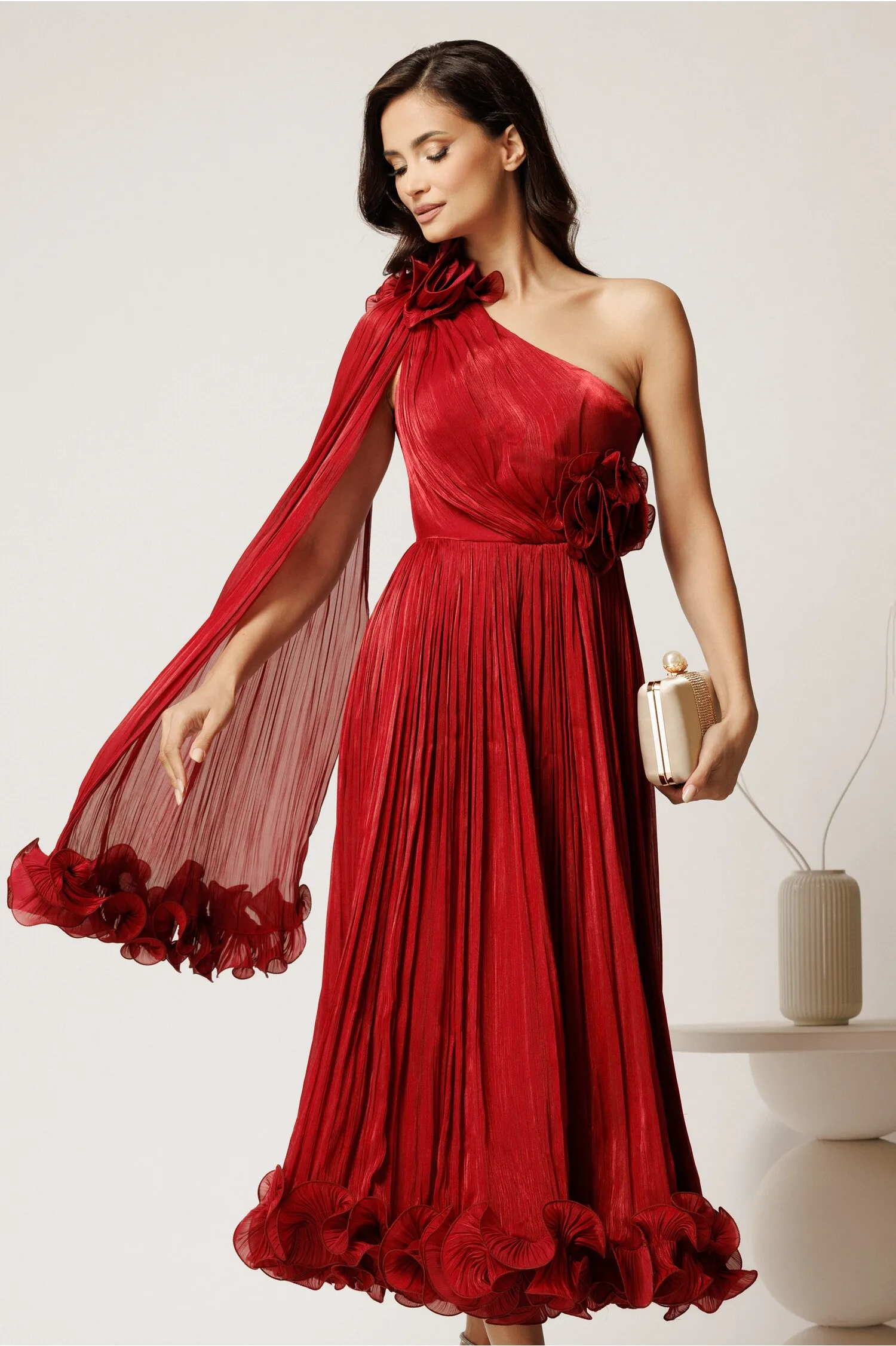 Rochie midi bordo din voal satinat cu volanase la baza si flori in talie si pe umar – Reduceri Exclusive