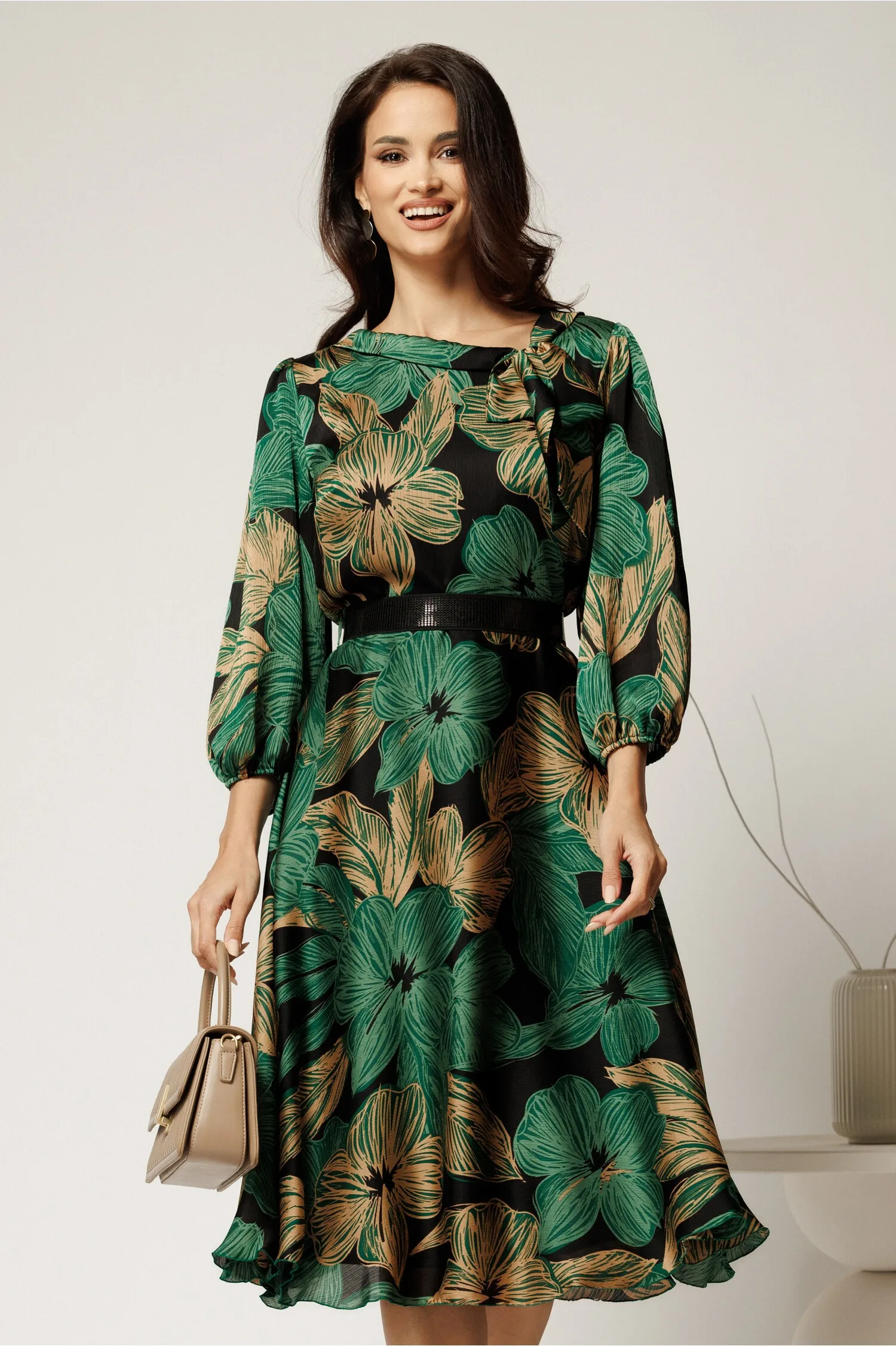 Rochie midi cu flori verzi si bej din voal in clos cu cordon in talie – Reduceri Exclusive