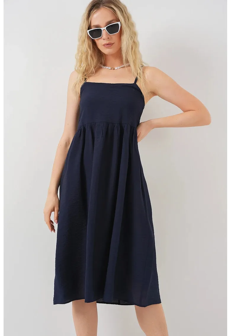 Rochie midi dama – HiCCUP – cu decolteu patrat – viscoza/nylon – bleumarin – Reduceri Exclusive
