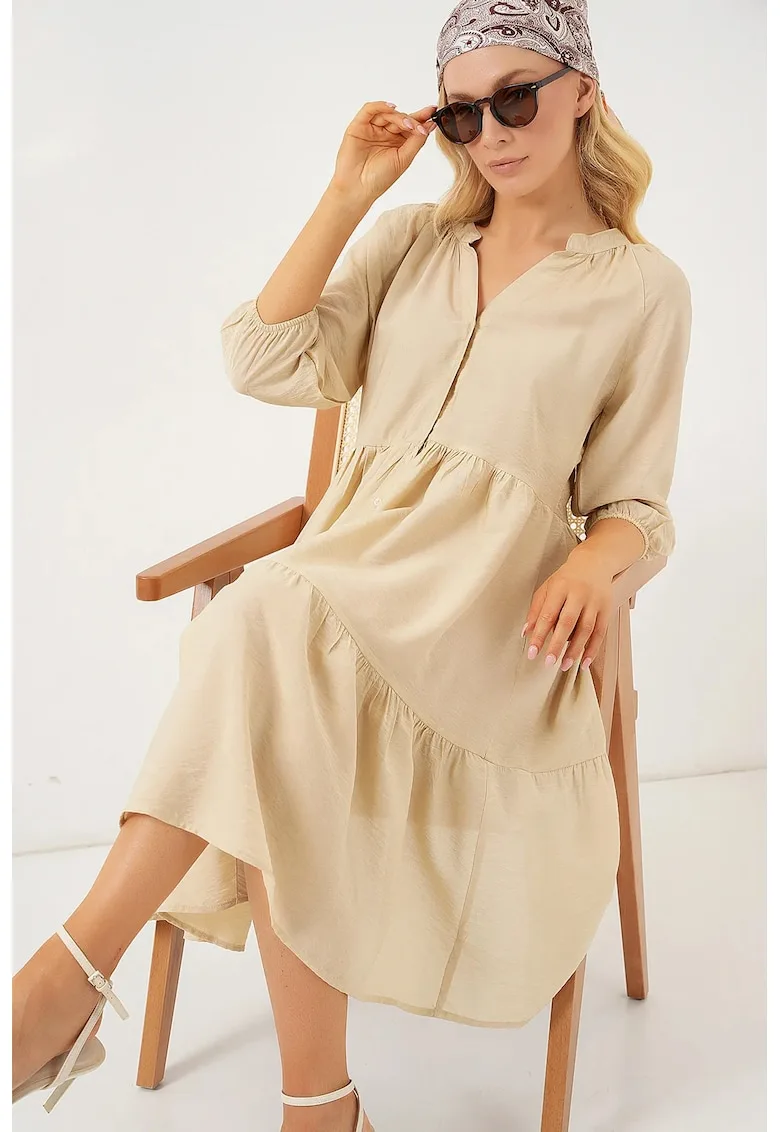 Rochie midi dama HiCCUP – maneci trei sferturi – viscoza/nylon – bej