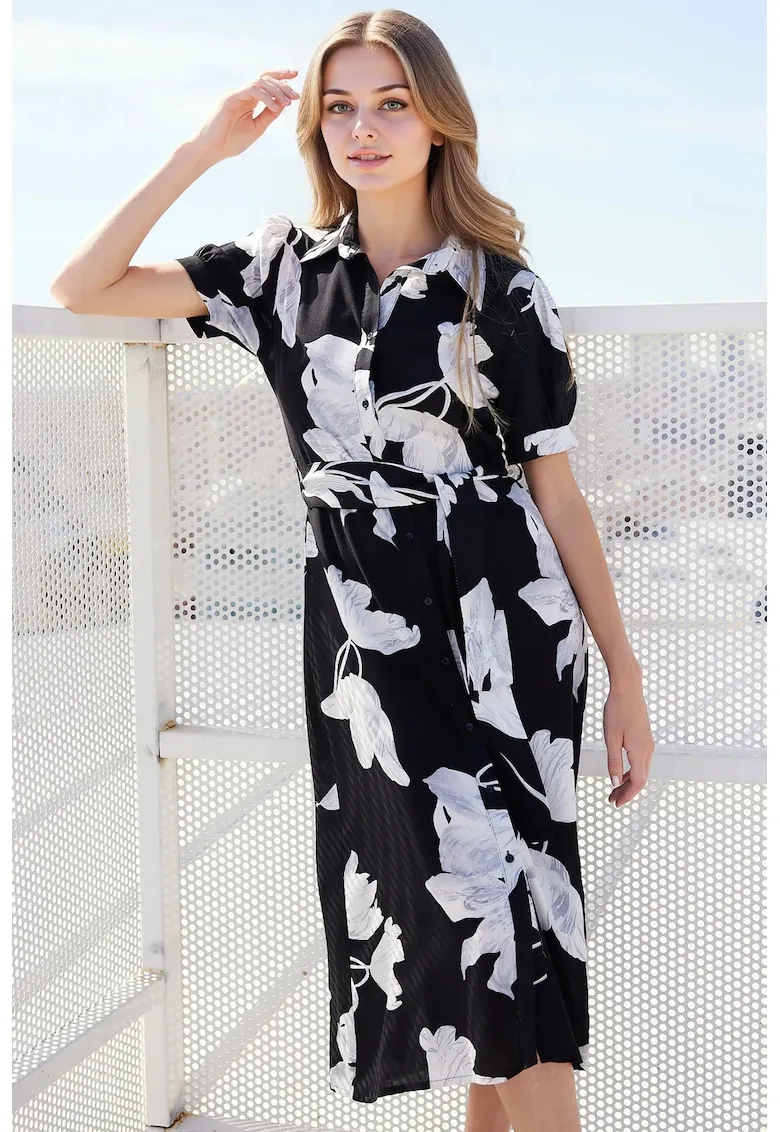 Rochie midi dama HiCCUP – viscoza – imprimeu floral – alb/negru