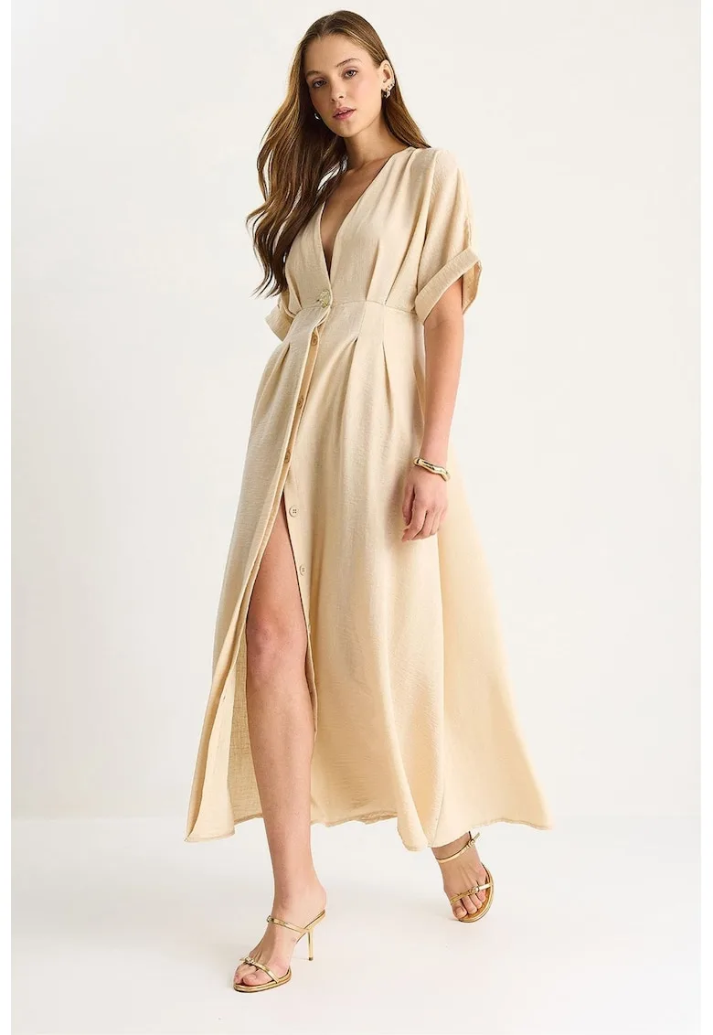 Rochie midi dama – textil – decolteu in V – cu slit – bej – Reduceri Exclusive
