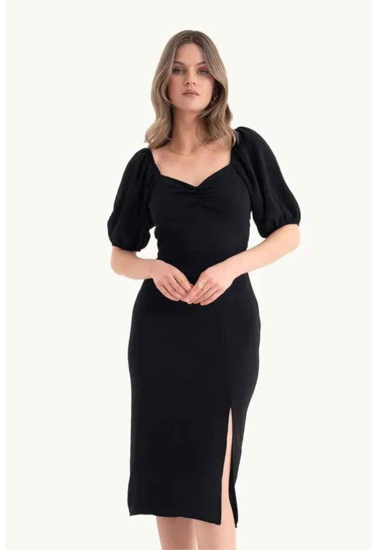 Rochie midi – decolteu in forma de inima – crapatura laterala – negru – textil – Reduceri Exclusive