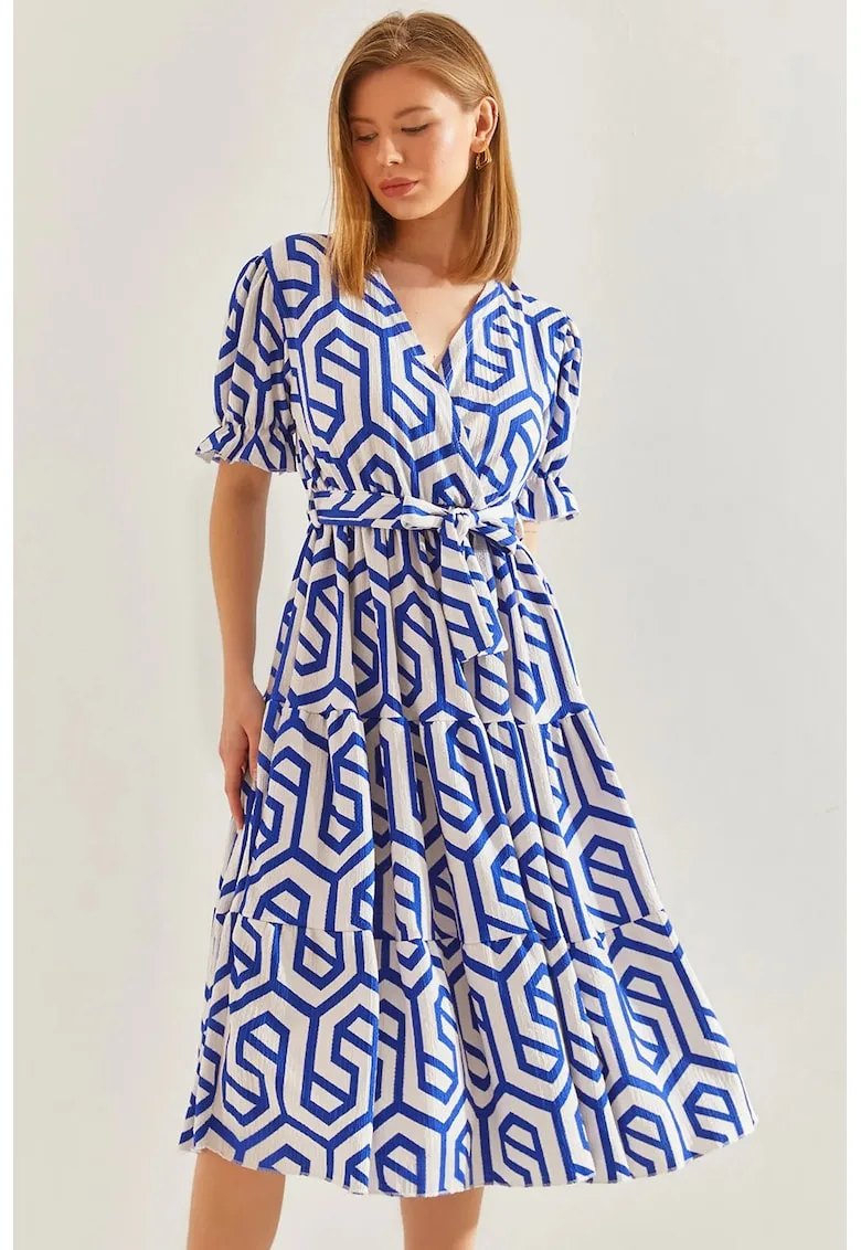 Rochie midi – decolteu in V – model geometric – albastru – viscoza – – Reduceri Exclusive