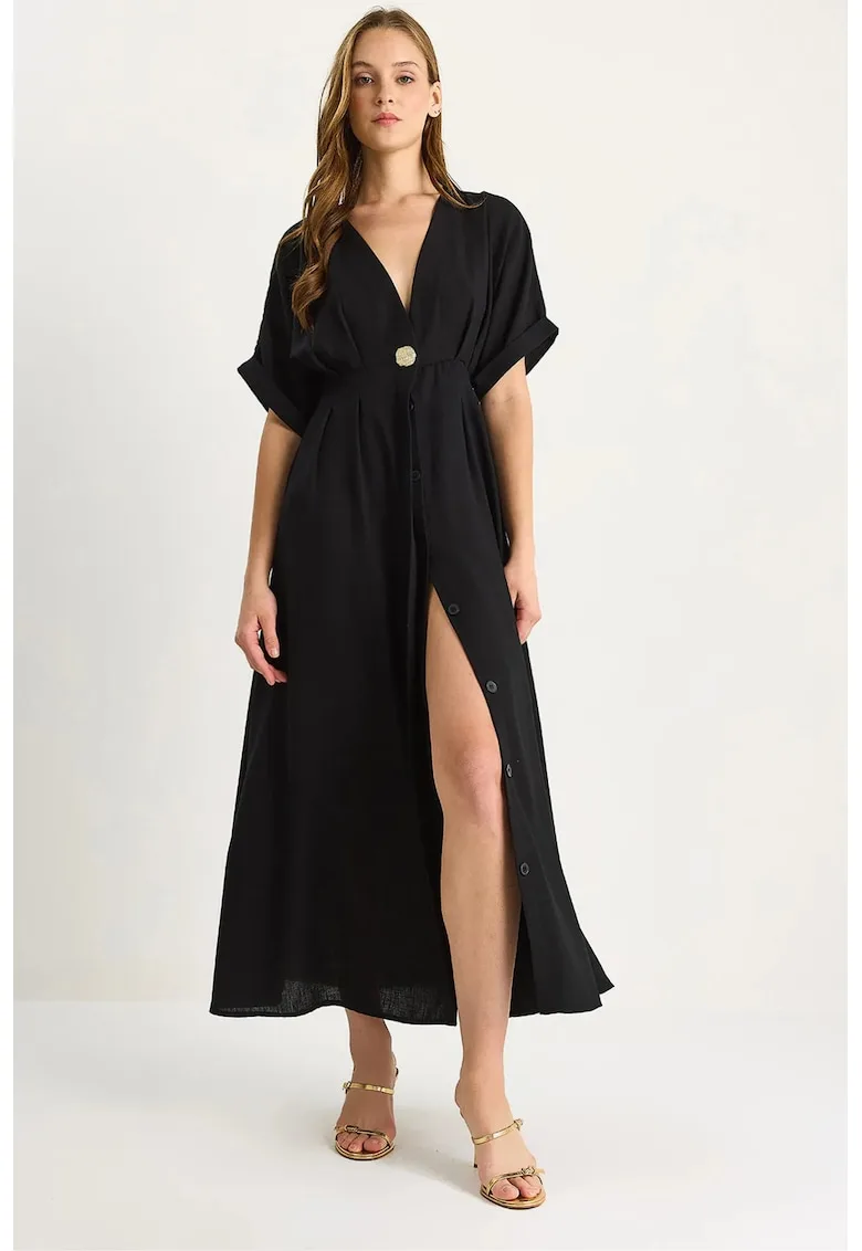 Descoperă rochia perfectă pentru evenimente speciale! Cumpără Rochie midi decolteu in V – neagra – textil acum de la FashionDays și profită de oferta limitată!