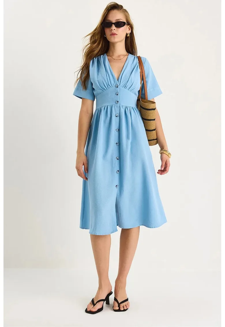 Rochie midi –  decolteu in V – textil – albastru deschis