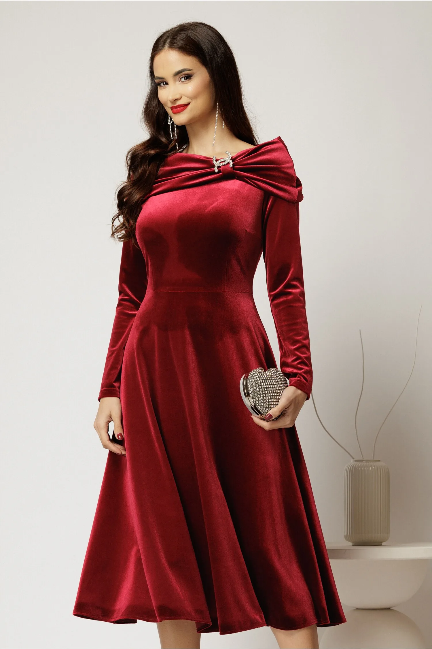 Rochie midi din catifea bordo cu umeri lasati si brosa – Reduceri Exclusive