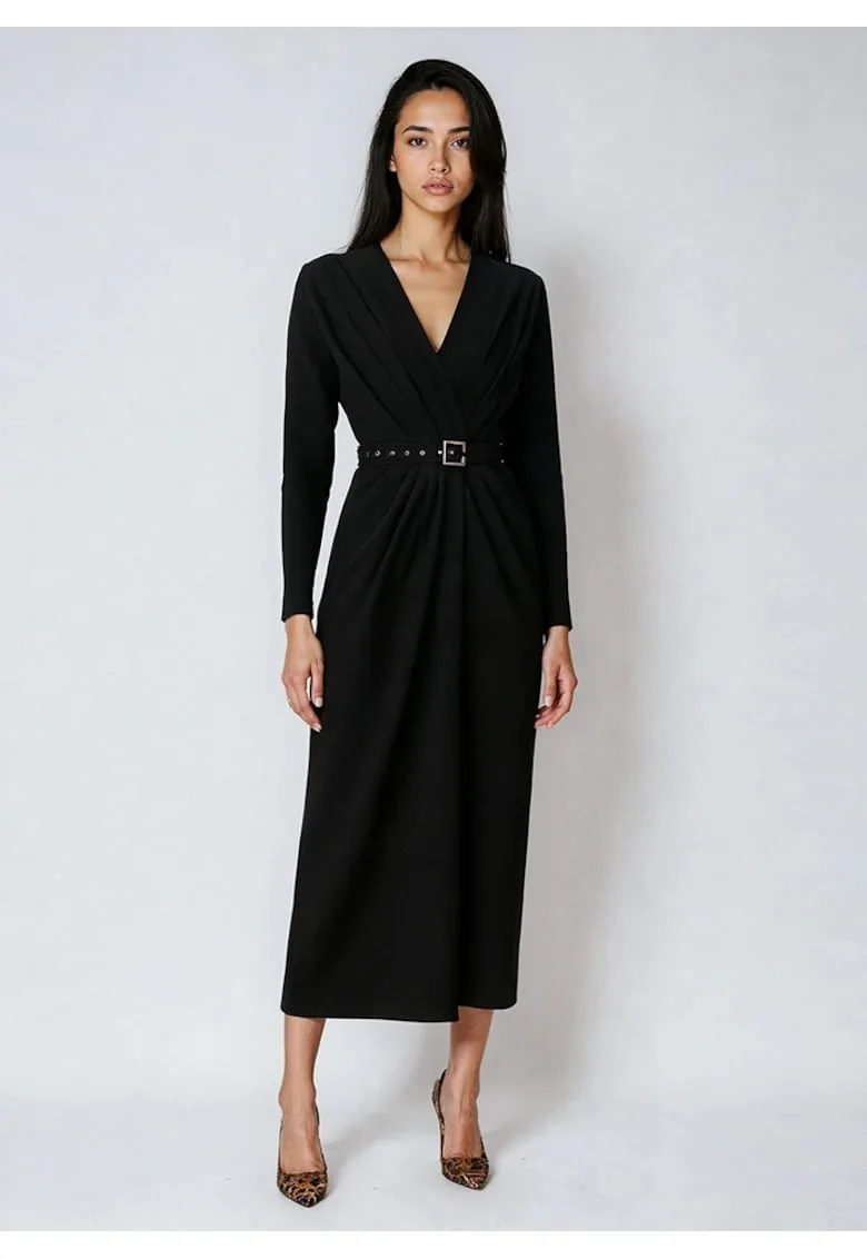 Caracteristici Culoare: negru Stil: elegant Material: poliester Imprimeu: uni Croiala: cambrata Lungime: midi Decolteu: in v Lungime maneca: maneca lunga Talie: cu o curea detasabila Detalii: design drapat Sistem inchidere: fermoar Compozitie Exterior: 98% poliester – 2% elastan Captuseala: 95% poliamida – 5% elastan.