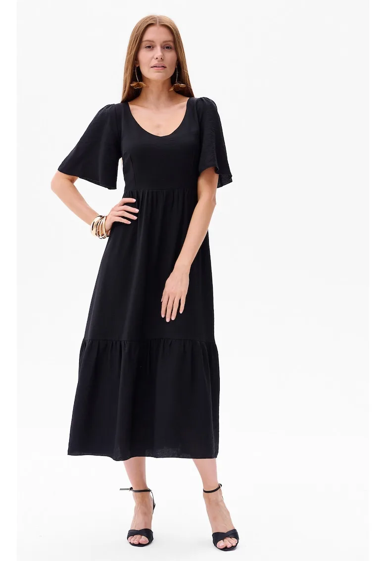 Caracteristici Culoare: negru Stil: casual Material: viscoza – nylon Imprimeu: uni Croiala: evazat Lungime: midi Decolteu: v Maneci: evazate Lungime maneca: maneca scurta.