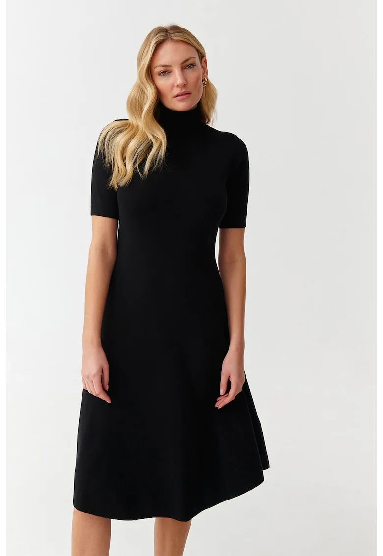 Caracteristici Culoare: negru Stil: elegant Material: poliester – viscoza – poliamida Imprimeu: uni Croiala: evazat Lungime: midi Guler: inalt Lungime maneca: maneca scurta Compozitie Exterior: 50% viscoza – 25% nylon – 25% poliester.