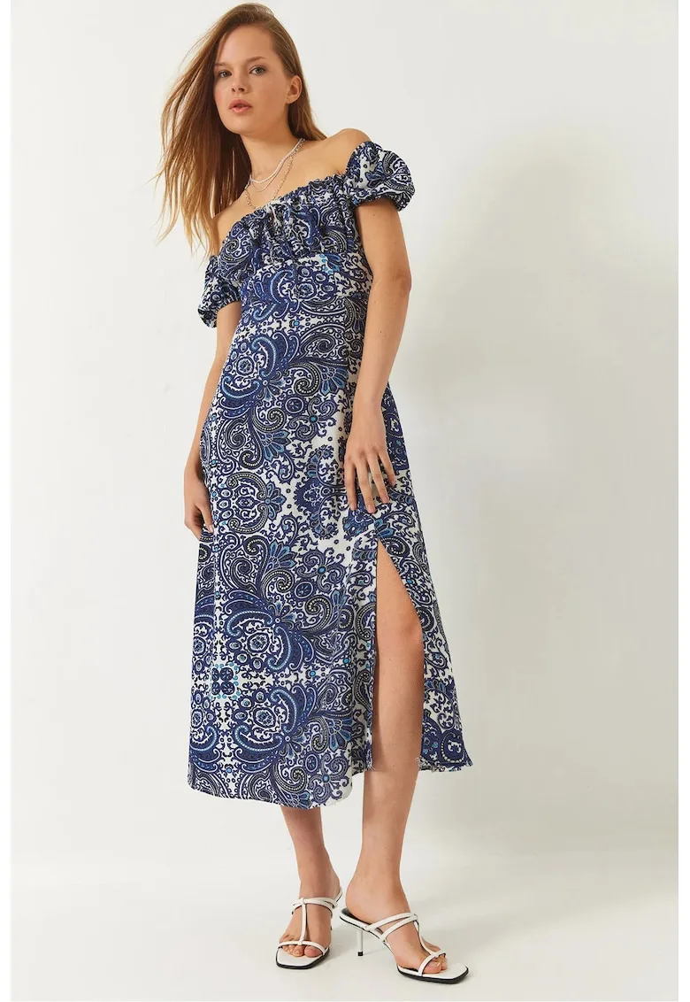 Rochie midi – fara bretele – model cu nod – albastru – viscoza – Reduceri Exclusive