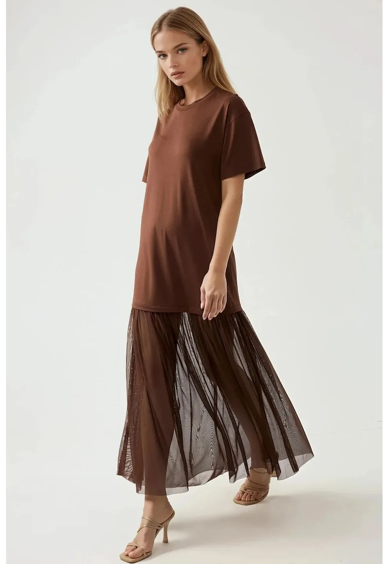 Rochie midi – fusta din tul – confortabila – maro – jerseu