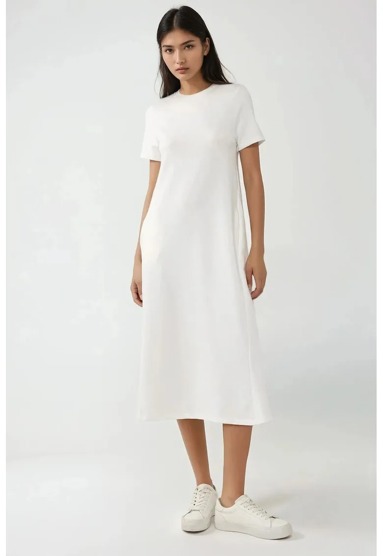 Rochie midi guler rotund – maneca scurta – alb – jerseu – Reduceri Exclusive