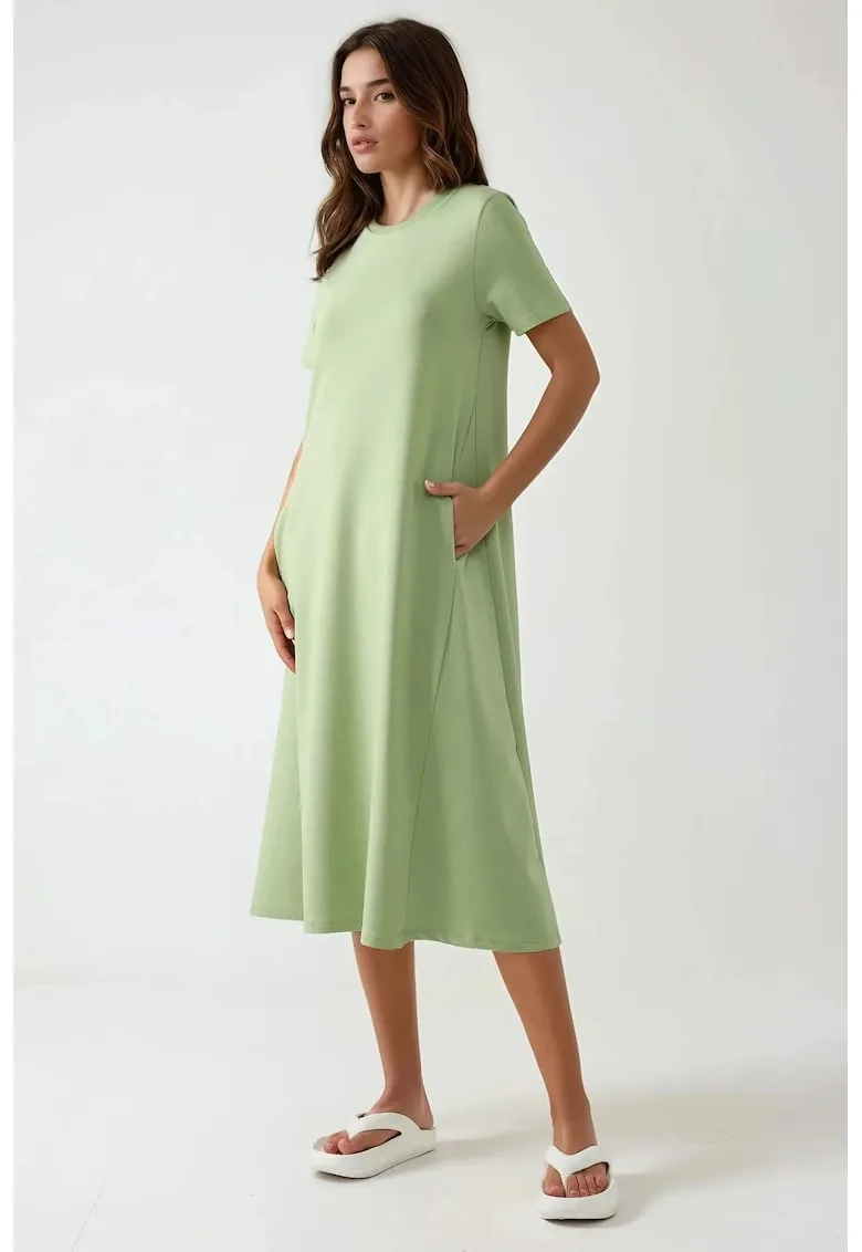Rochie midi guler rotund – maneca scurta – verde – jerseu – Reduceri Exclusive