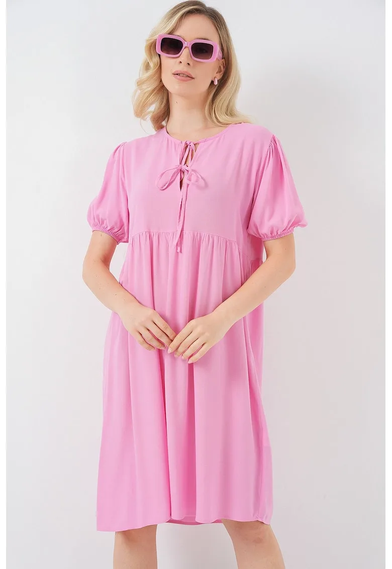 Rochie midi HiCCUP BDART – roz – textil – cu snur – Reduceri Exclusive