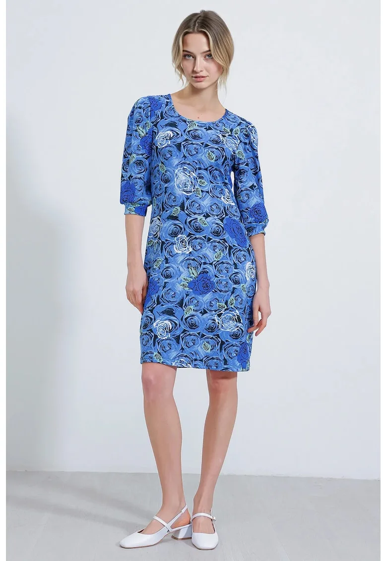 Rochie midi HiCCUP cu broderie florala – maneci trei sferturi – albastru – poliester