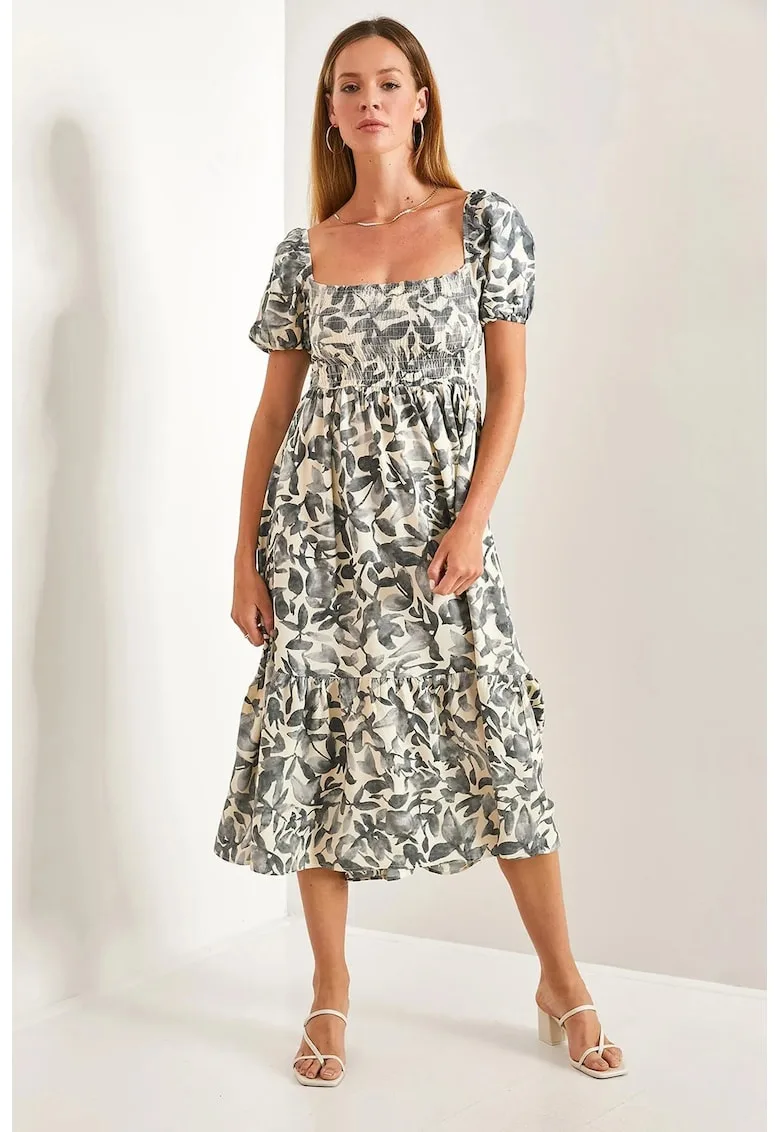 Rochie midi – imprimeu floral – guler patrat – gri – viscoza – Reduceri Exclusive