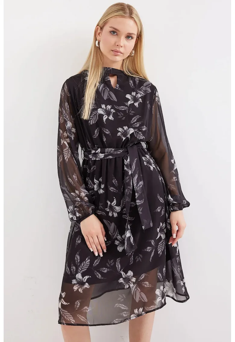 Rochie midi – imprimeu floral – negru – poliester – Reduceri Exclusive
