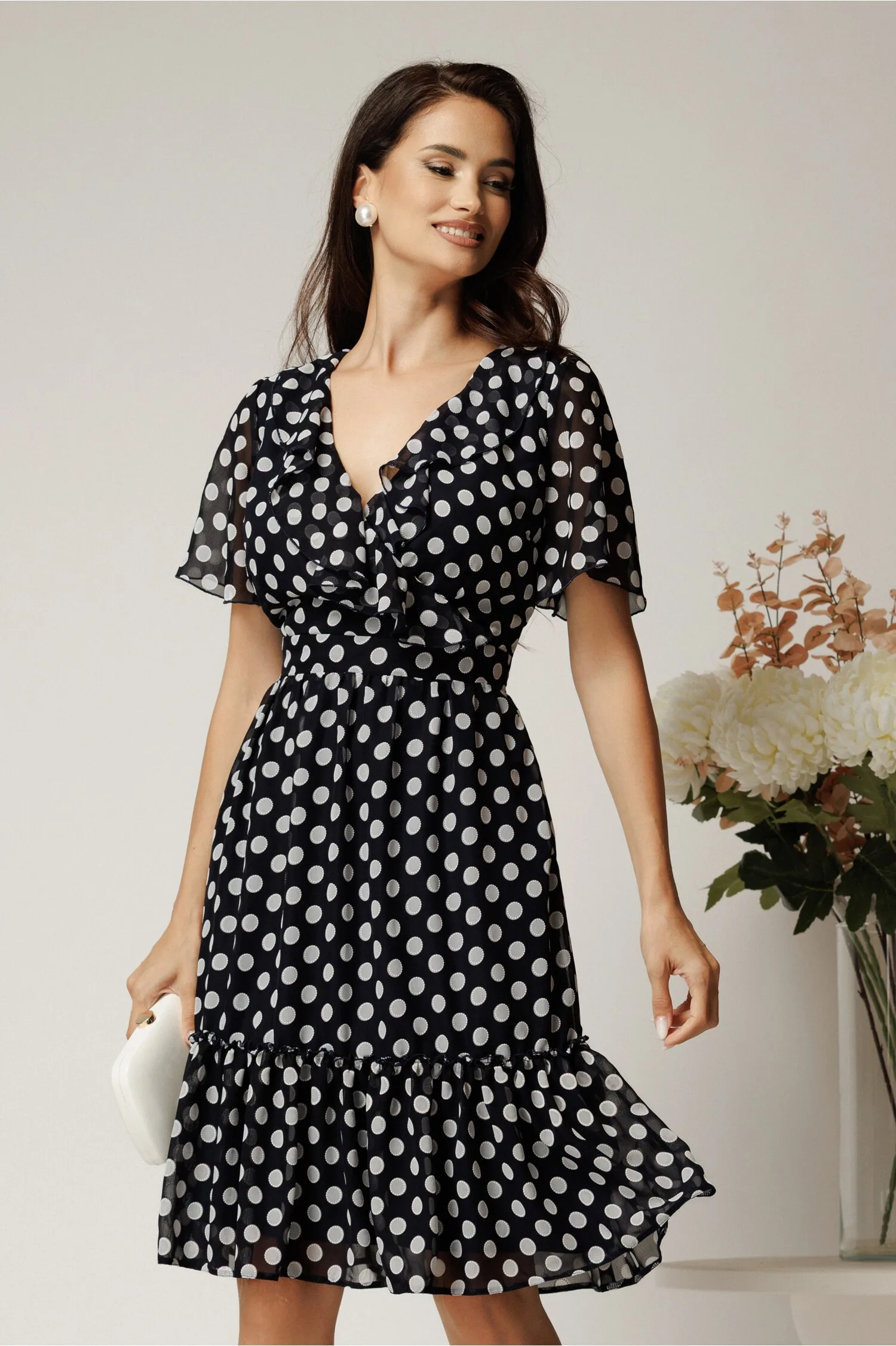 Rochie midi neagra din voal cu buline albe si volane – Reduceri Exclusive