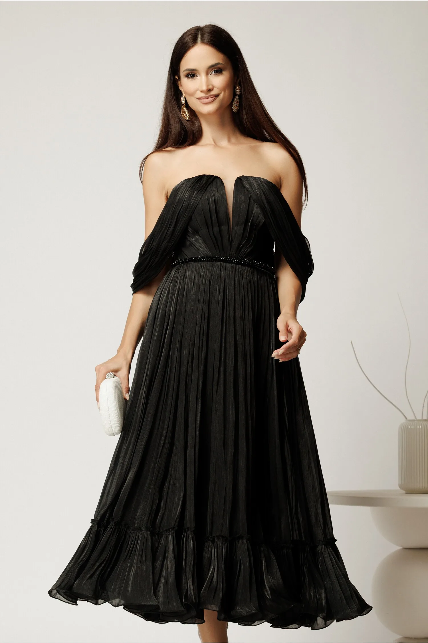 Rochie midi neagra in clos din voal satinat cu aplicatii cazute pe umeri – Reduceri Exclusive