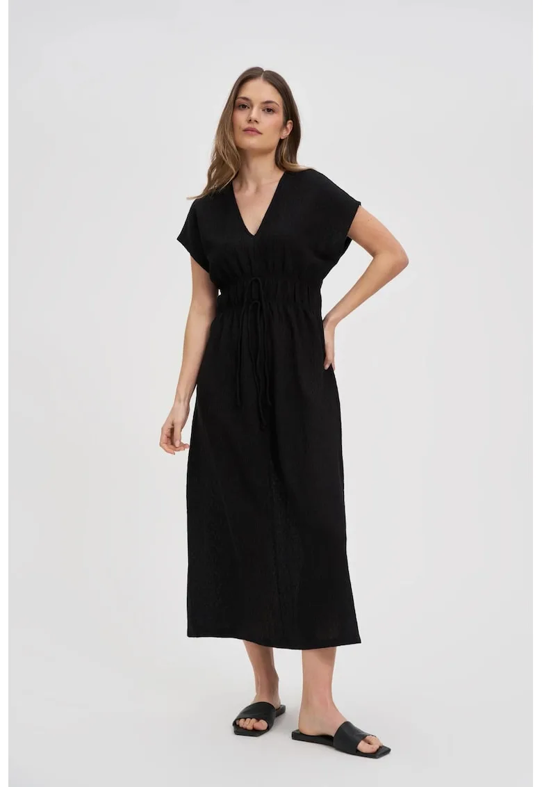 Rochie midi neagra – marime XS – cu legatura si elastic in talie – Reduceri Exclusive