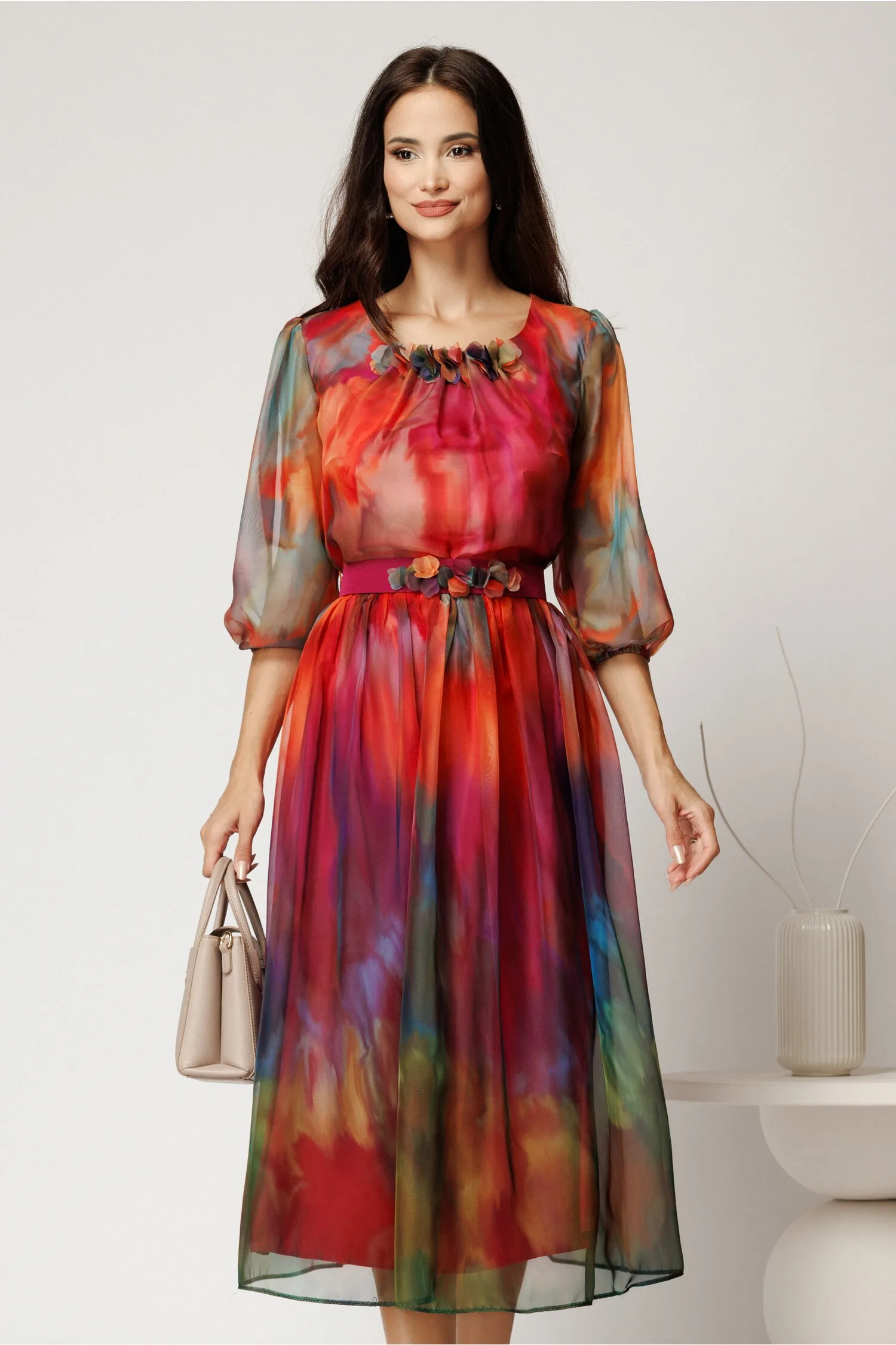 Rochie midi orange din voal cu imprimeuri magenta si cordon cu flori in talie