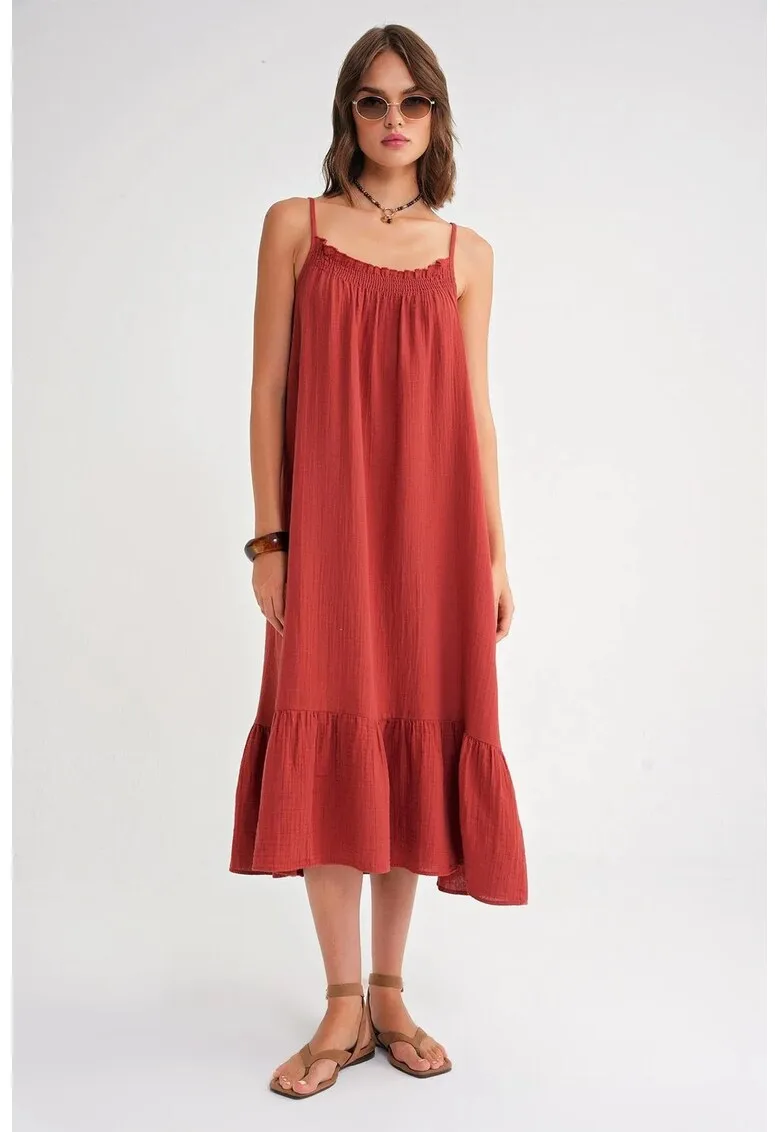 Rochie Midi rosu caramiziu – detalii volane – material textil – Reduceri Exclusive