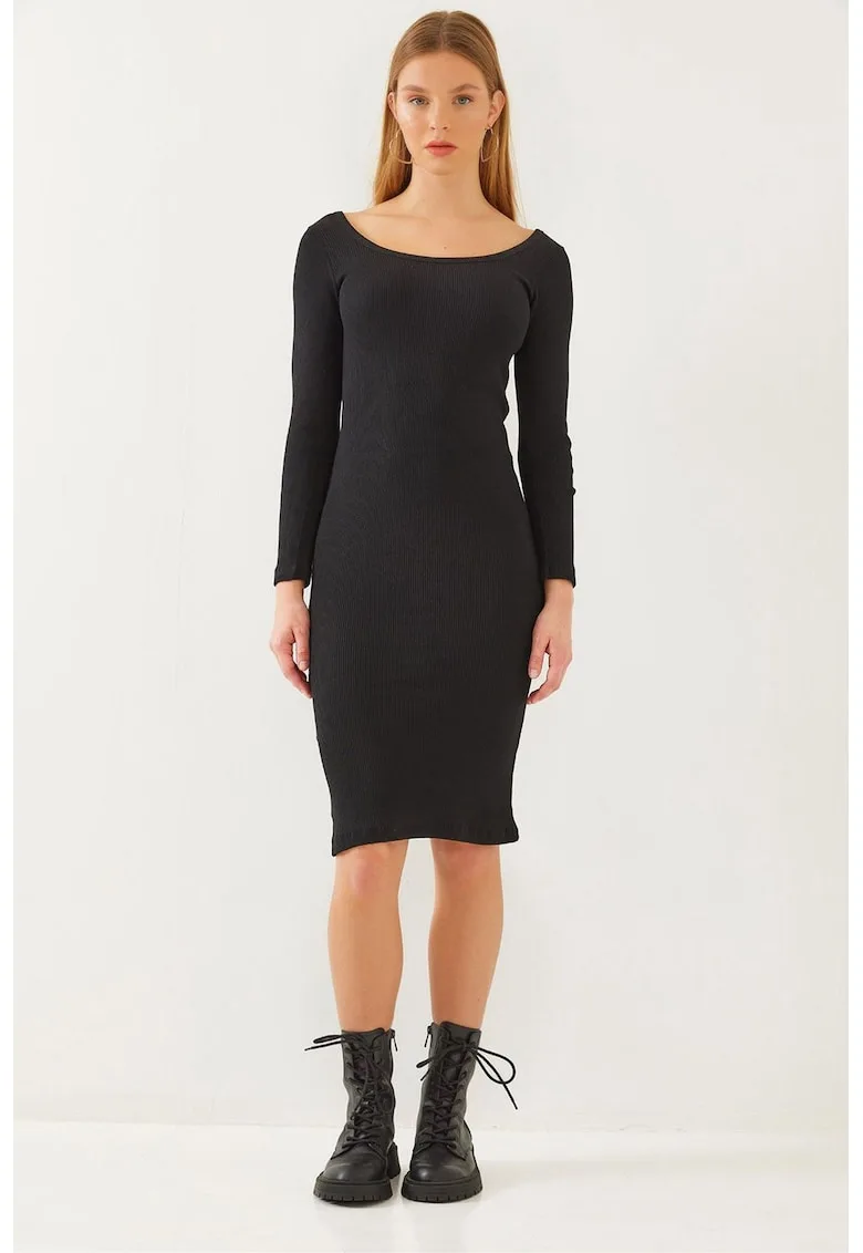 Rochie midi – texturata cu nervuri – guler patrat – neagra – jerseu – – Reduceri Exclusive