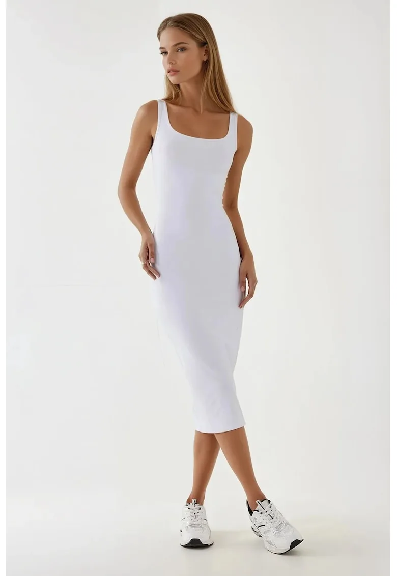 Rochie midi – texturata – mulata – Alb – jerseu – Reduceri Exclusive