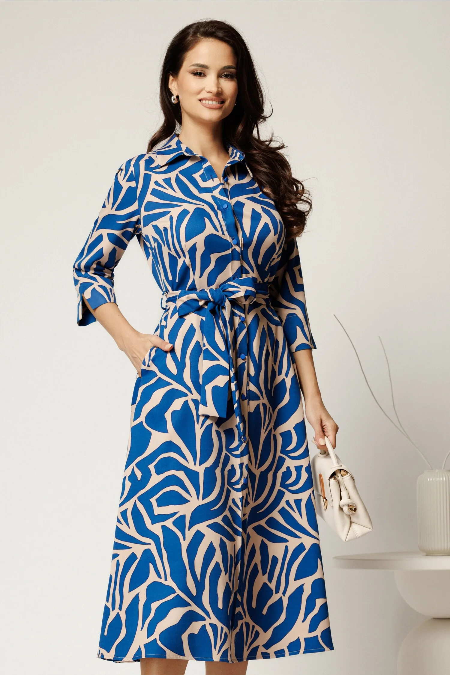 Rochie midi tip camasa bej cu imprimeuri albastre si curea in talie – Reduceri Exclusive