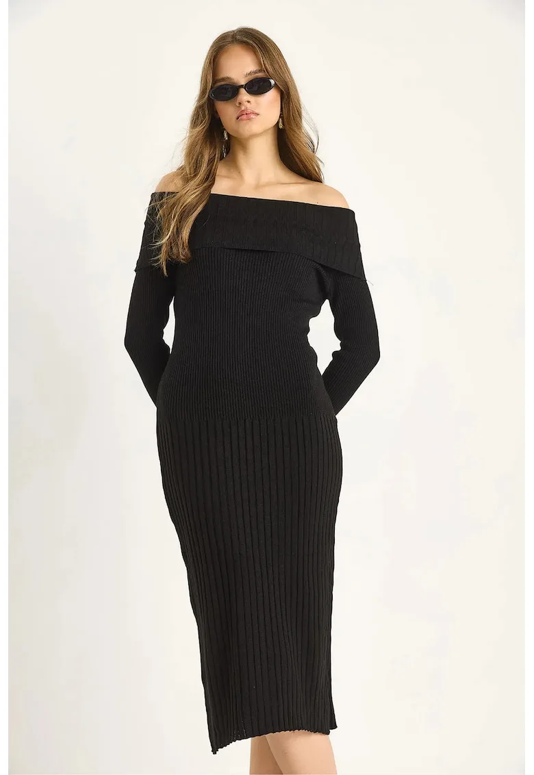 Rochie midi – tricot – Negru – – Reduceri Exclusive
