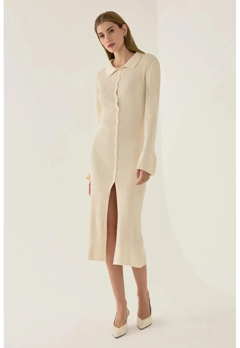 Rochie midi tricotata cu nasturi si crapatura – bej – material acril