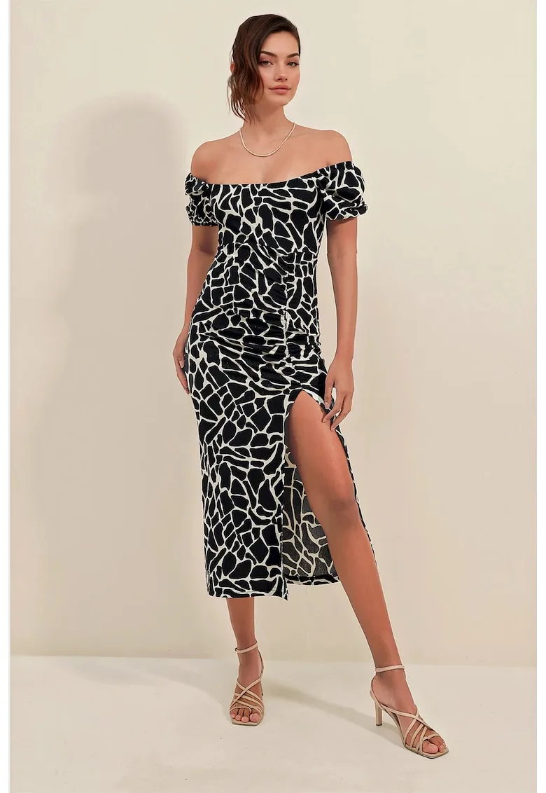 Rochie midi tricotata dama HiCCUP – decolteu patrat – poliester/lycra – negru/alb
