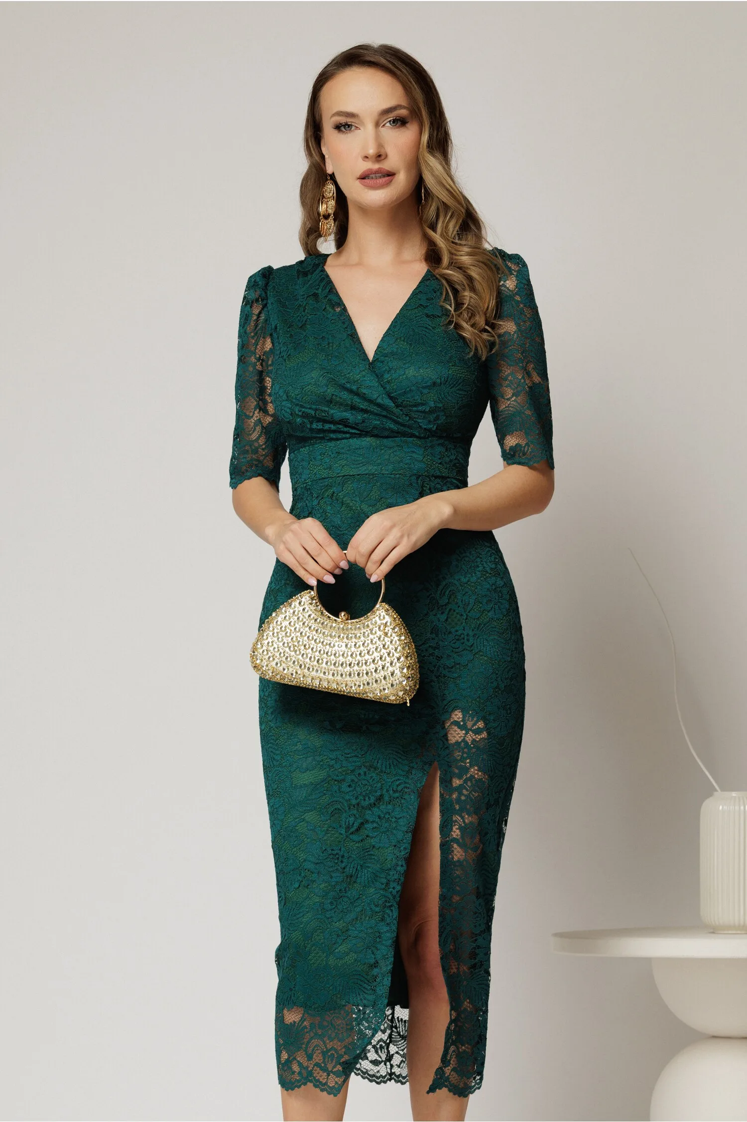 Rochie midi verde de ocazie din dantela conica si decolteu petrecut – Reduceri Exclusive