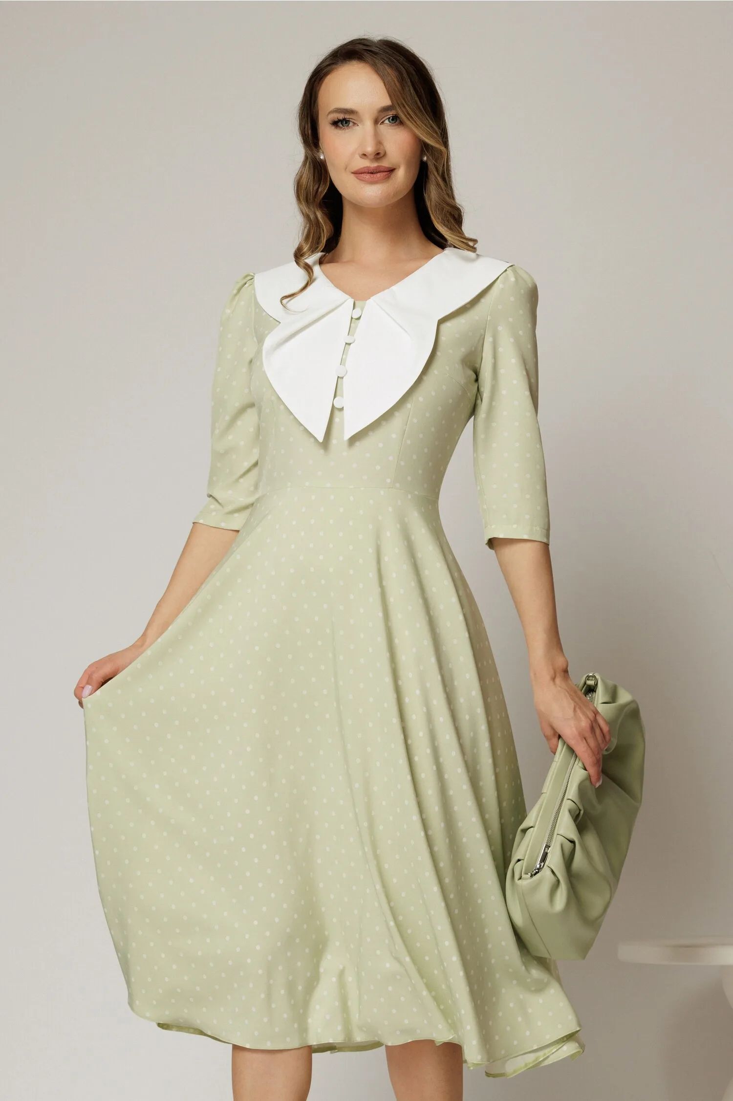 Rochie midi verde fistic cu buline si guler amplu croi clos – Reduceri Exclusive