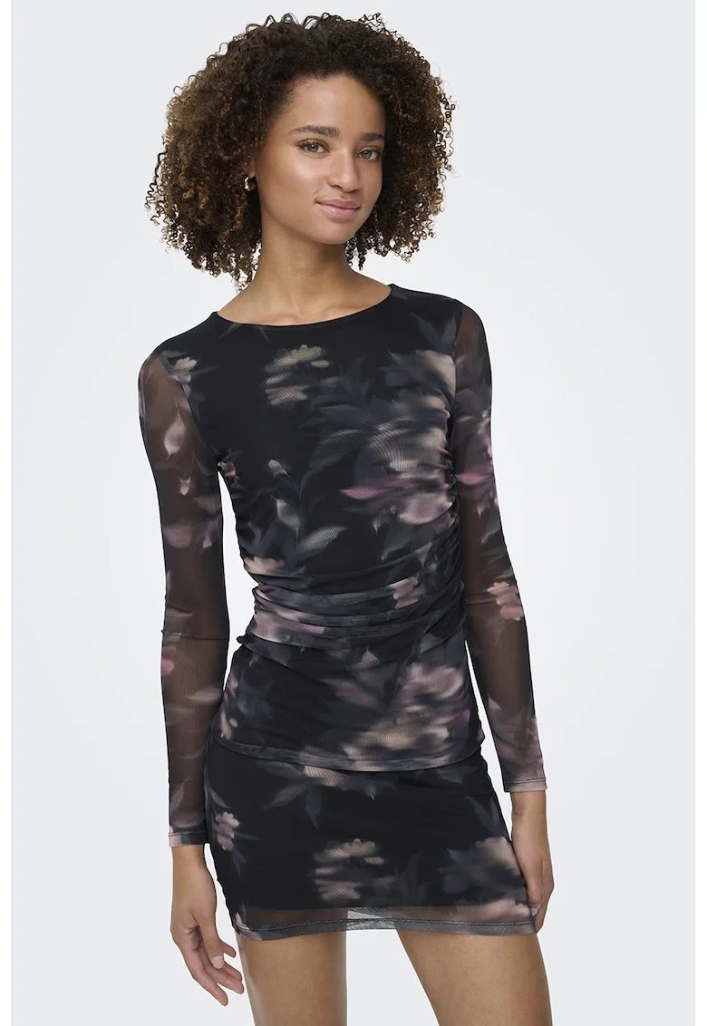 Caracteristici Culoare: negru – lila Stil: casual Material: poliester Imprimeu: floral Croiala: cambrata Lungime: scurta Decolteu: rotund Maneci: semitransparente Lungime maneca: maneca lunga Detalii: detalii drapate Compozitie Exterior: 95% poliester reciclat – 5% elastan.