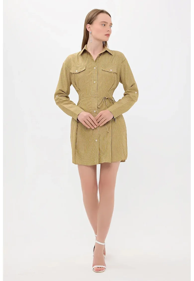 Rochie mini – cu dungi – detalii cu nasturi – verde – tesatura – Reduceri Exclusive