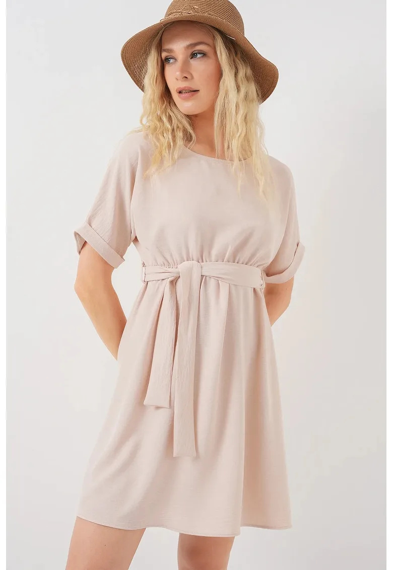 Rochie mini dama cu cordon – poliester/elastan – bej – Reduceri Exclusive