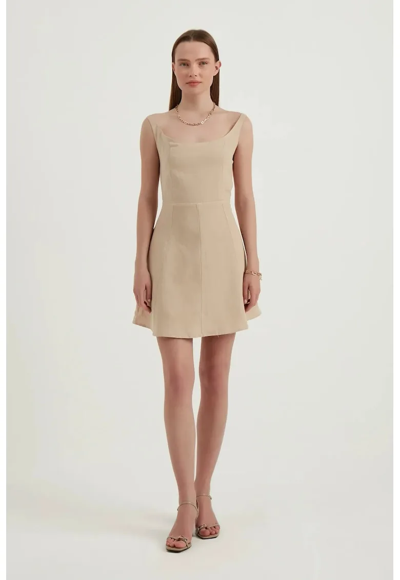 Rochie mini –  decolteu patrat – spate fara bretele – bej – textil