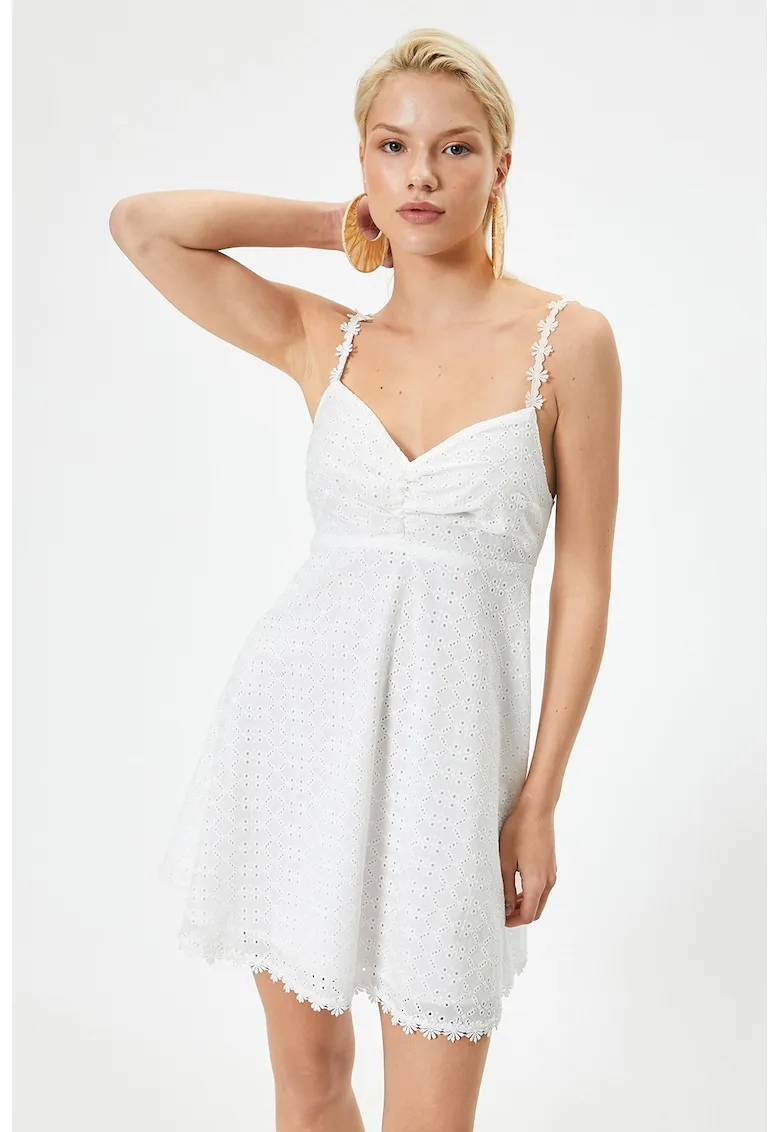 Caracteristici Culoare: alb Stil: casual Material: bumbac Imprimeu: uni Croiala: evazat Lungime: scurta Decolteu: in v Barete: ajustabile Detalii: model cu broderie Compozitie Exterior: 100% bumbac Captuseala: 100% bumbac.