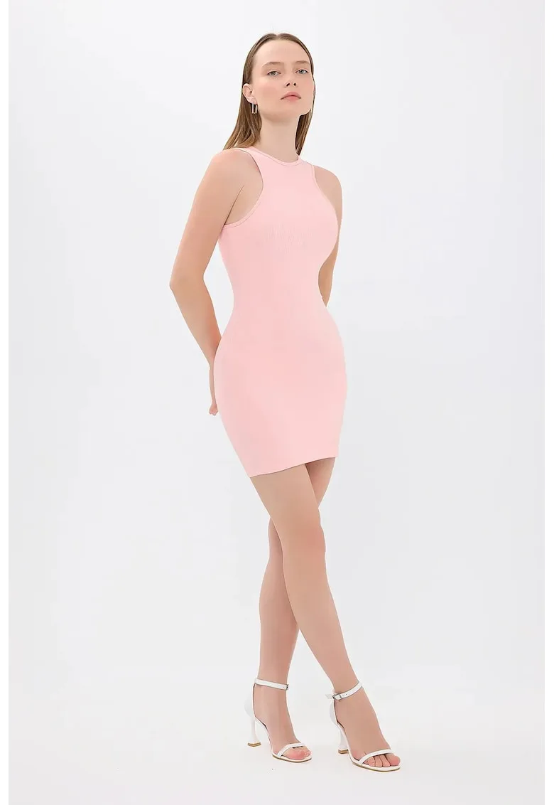 Rochie mini – fara maneci – guler halter – roz – textil – Reduceri Exclusive