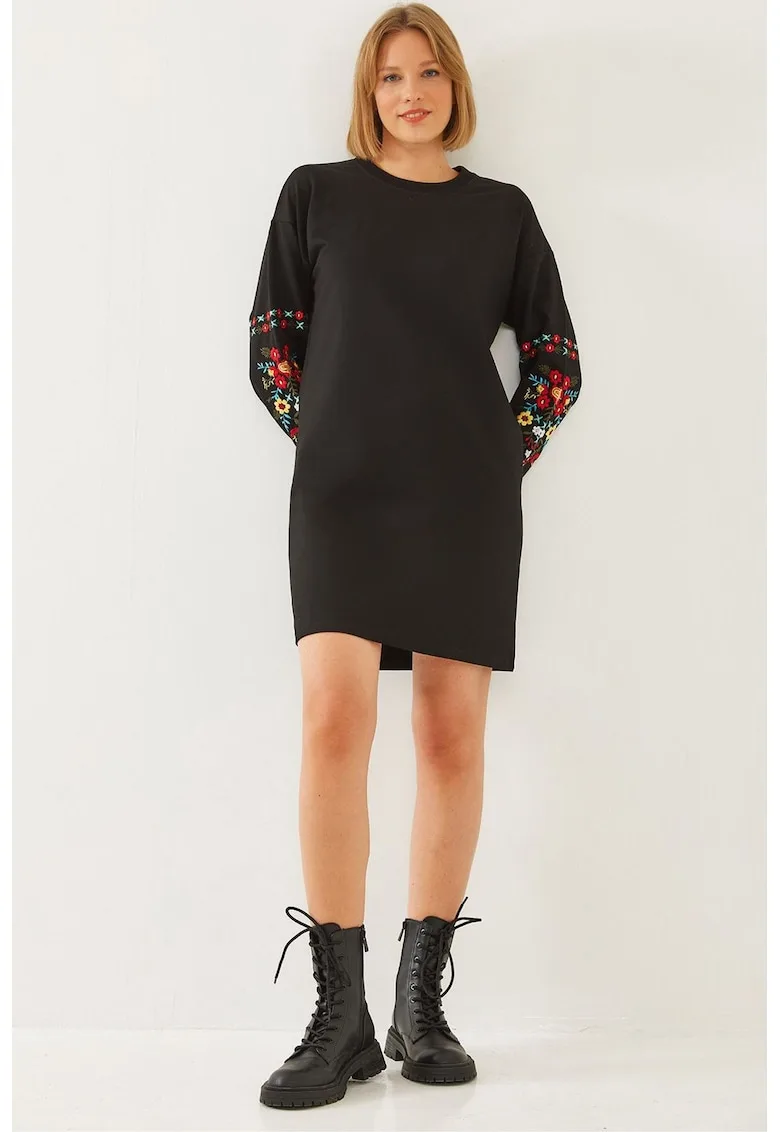 Rochie mini – guler rotund – broderie – negru – jerseu – Reduceri Exclusive