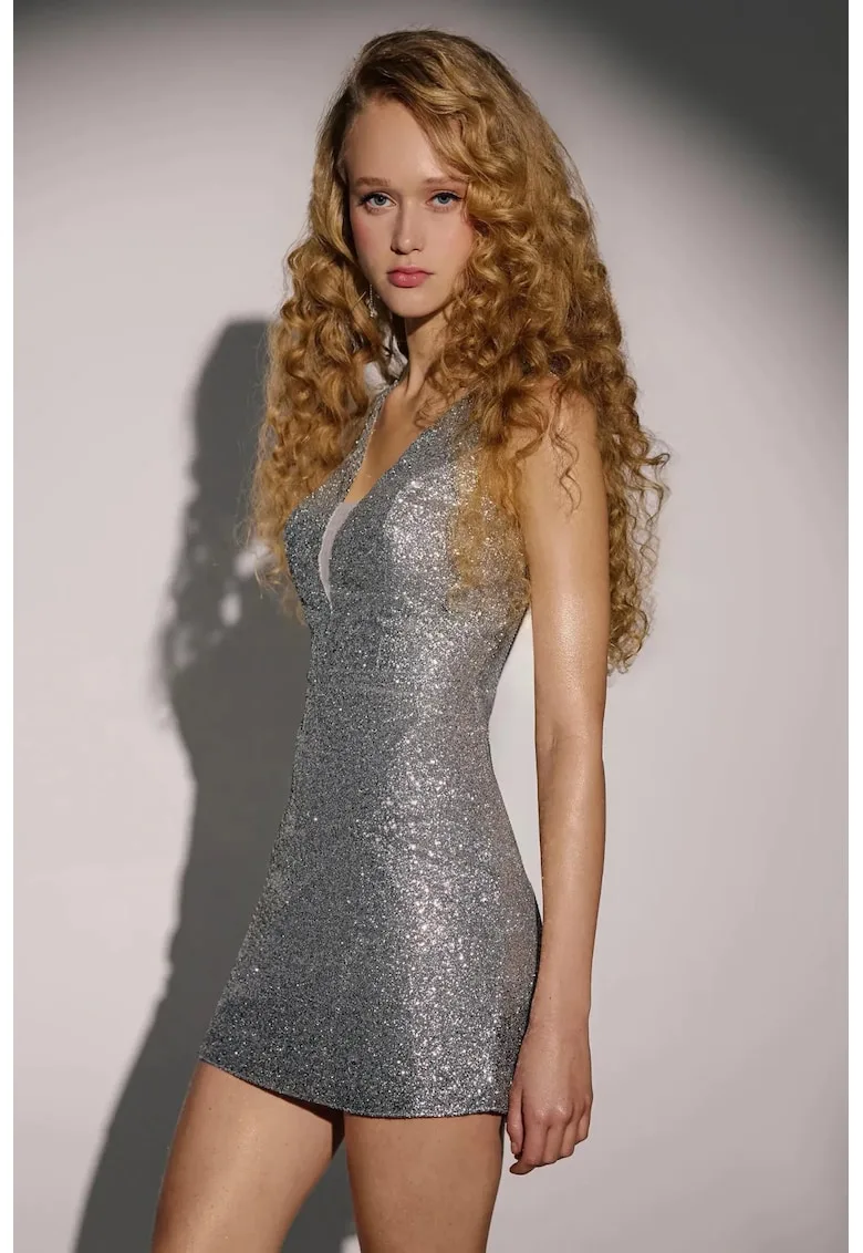Rochie mini – mulata – cu sclipici – gri – jerseu – Reduceri Exclusive